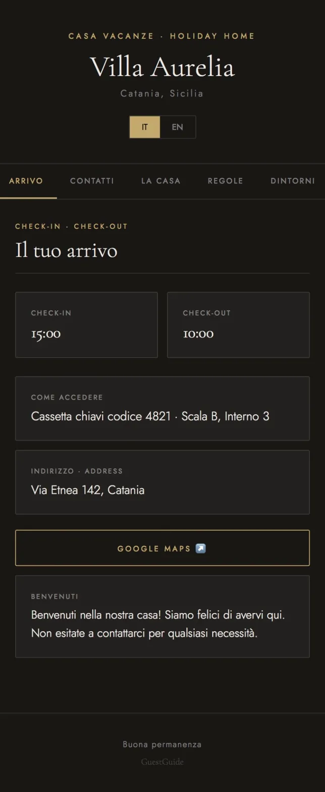 Crea una guida professionale per i tuoi ospiti: bilingue, personalizzata, condivisibile via link o QR code. Senza abbonamenti, senza scadenze.